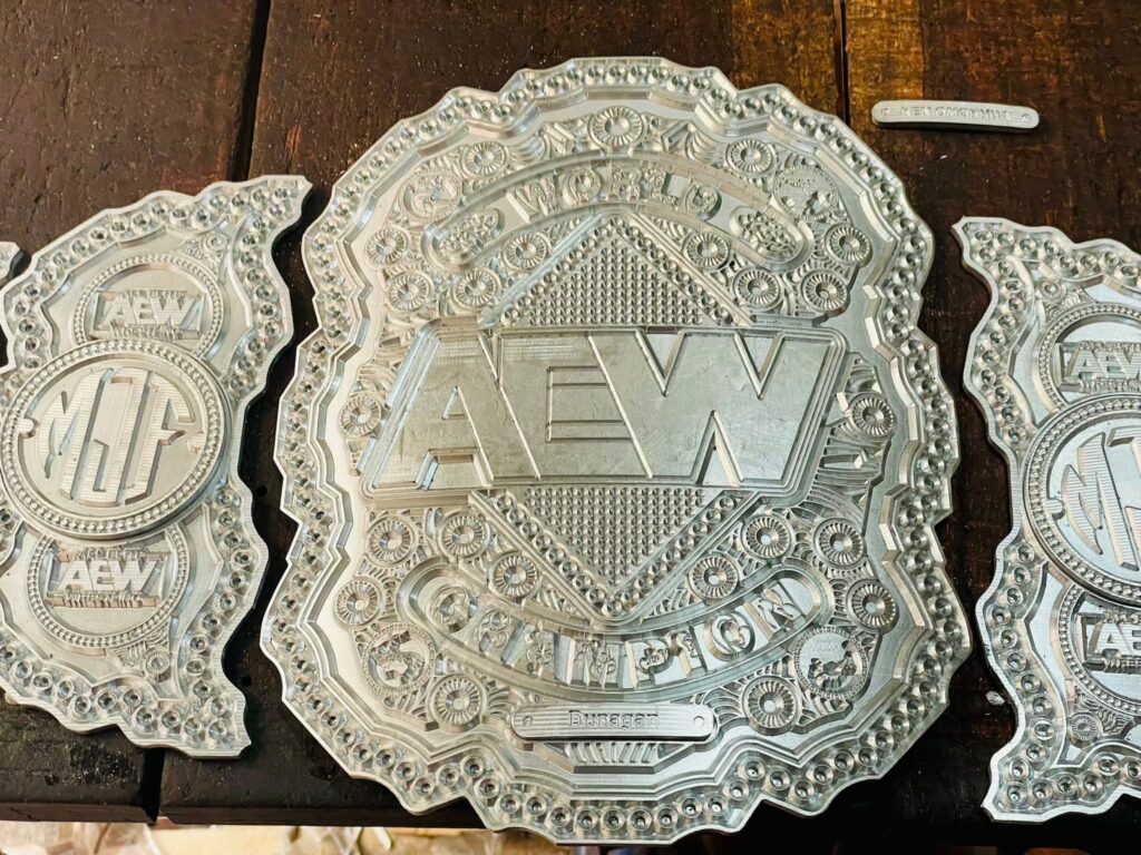 Raw CNC-milled AEW plates ready for the next step. High-precision work for the ultimate wrestling fan.