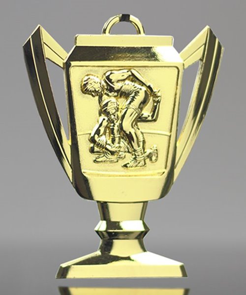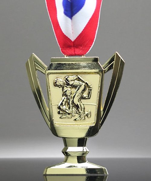 Choose the stately Trophy Cup Wrestling Medals to recognize your top finishers! Available with free engraving on the back and free Red-White-Blue neck ribbon. Beautiful and easy to purchase. Immediate shipping is available to the entire USA!